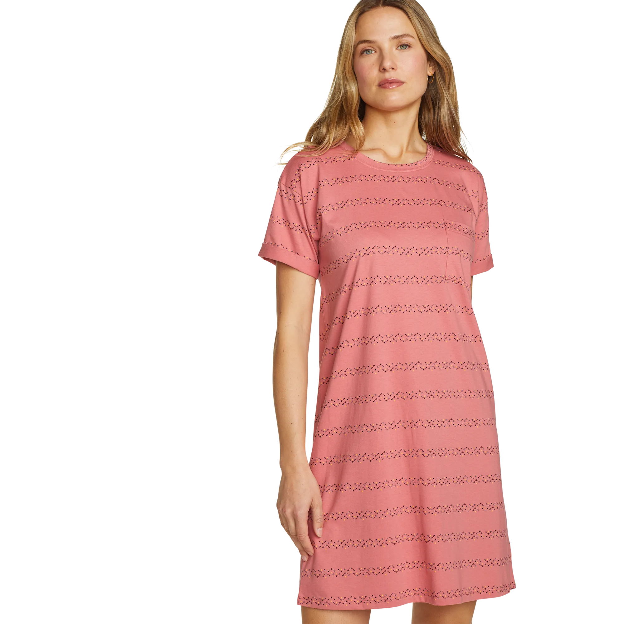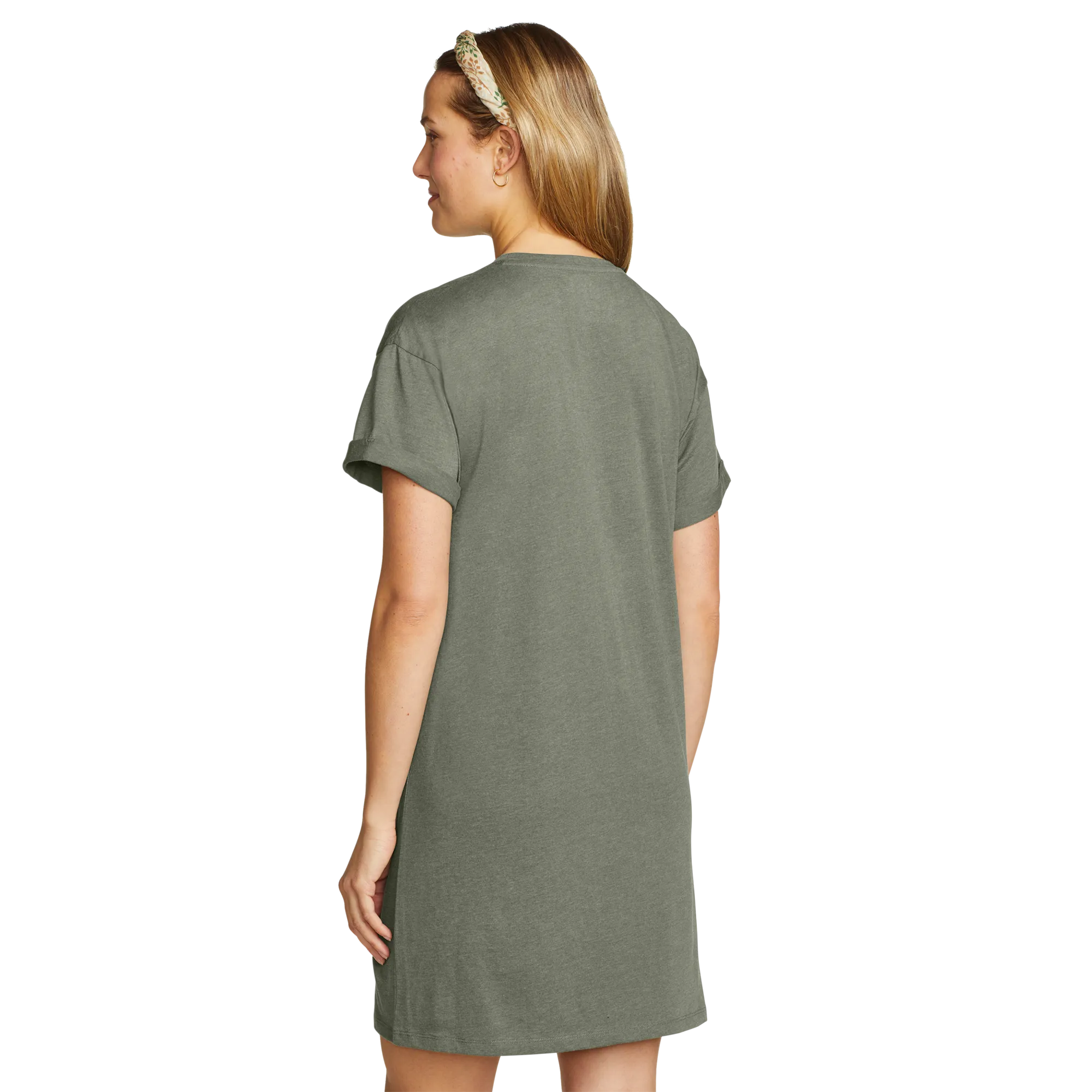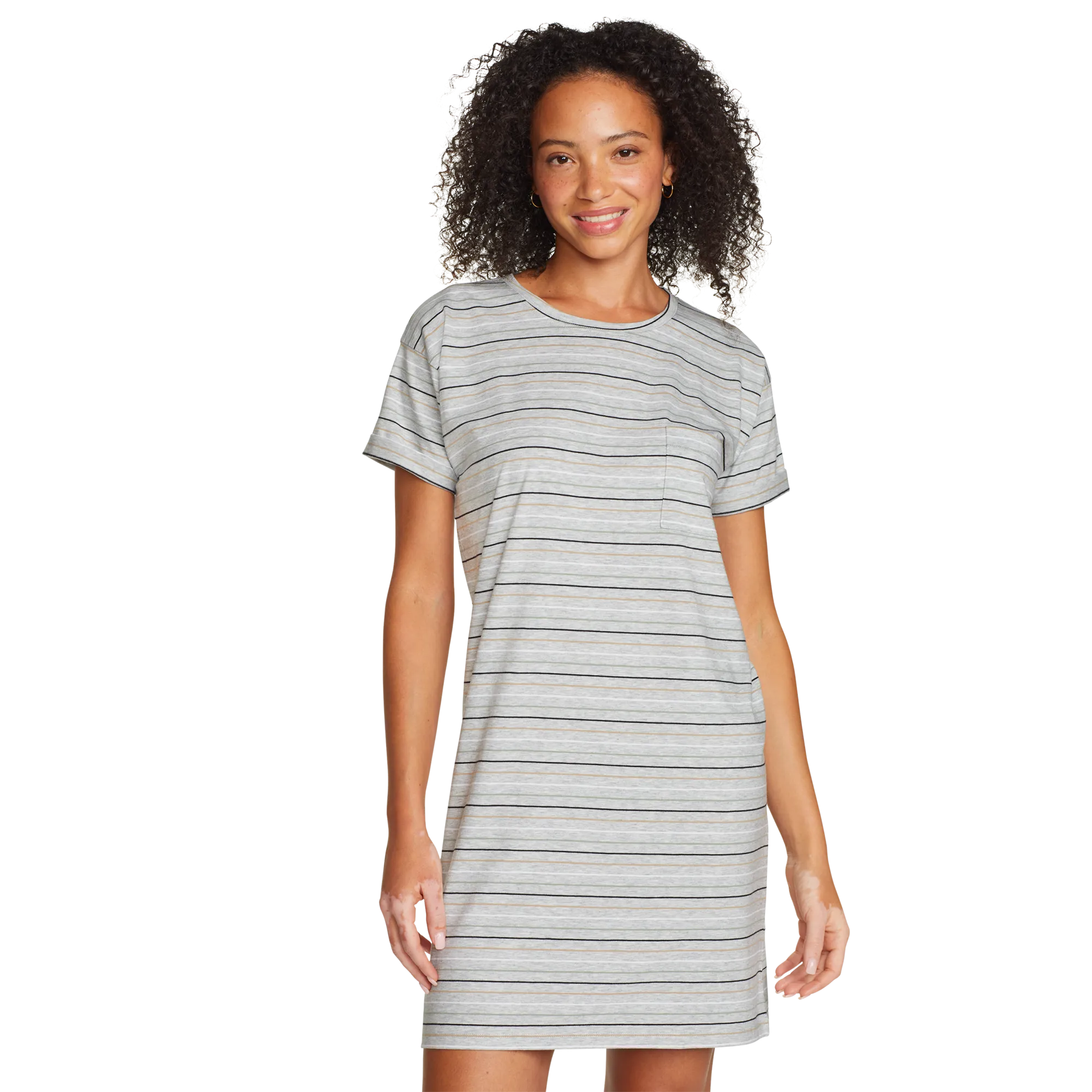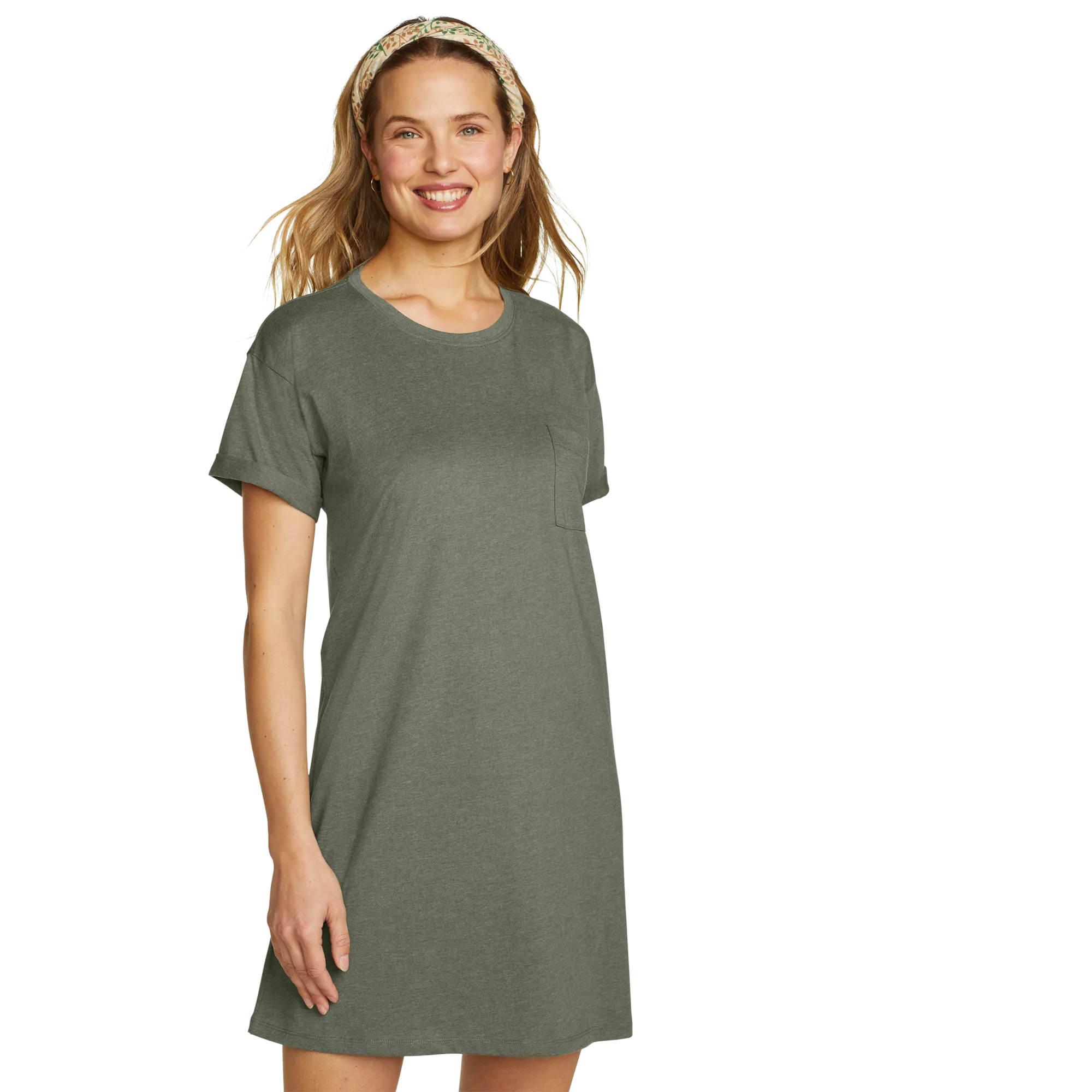 Soft, moisture-wicking fabric makes this knee-length T-shirt dress an all-day favorite. Its simple, flattering lines and easy-care convenience also make it a great traveler.