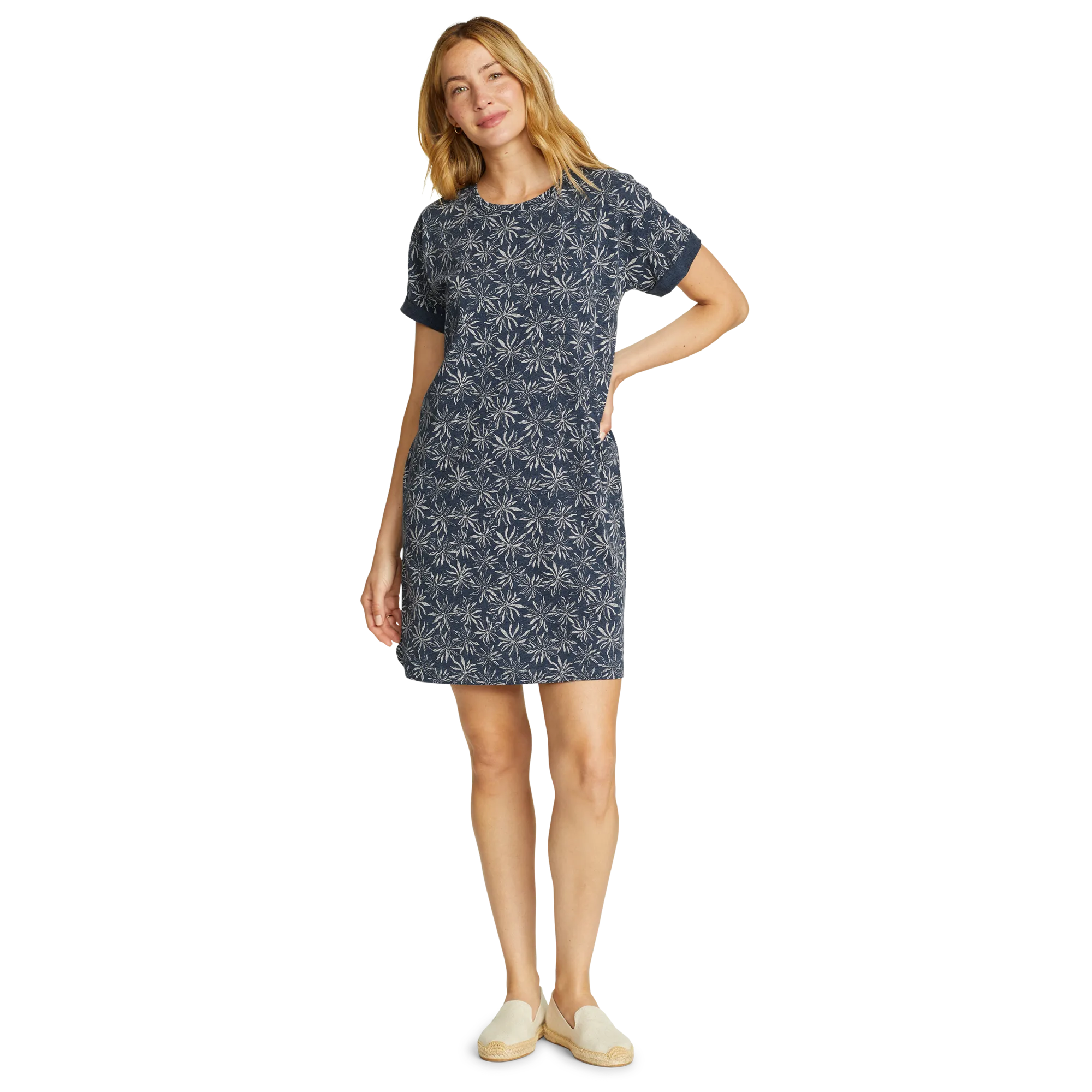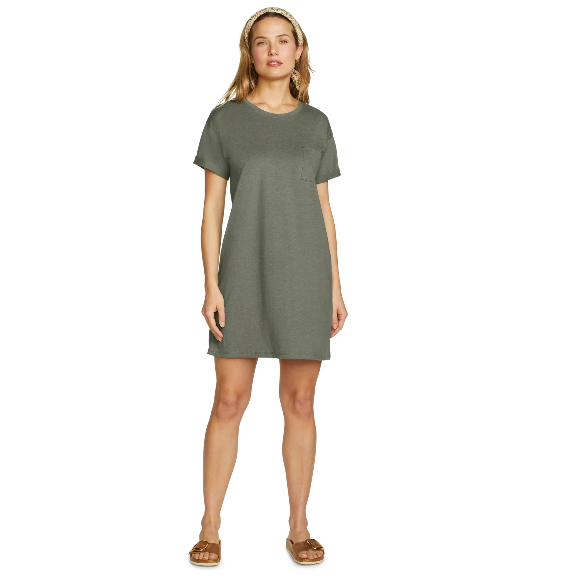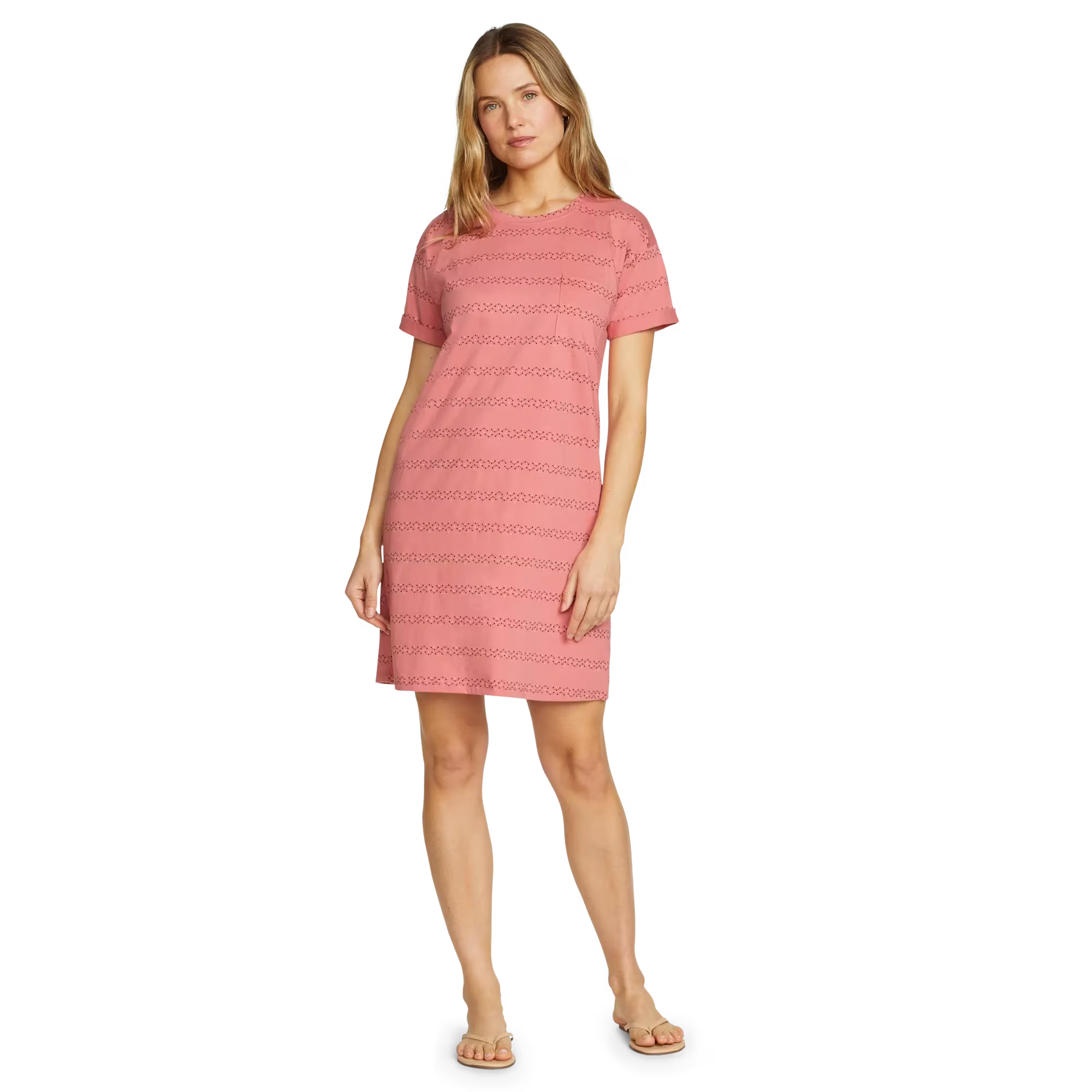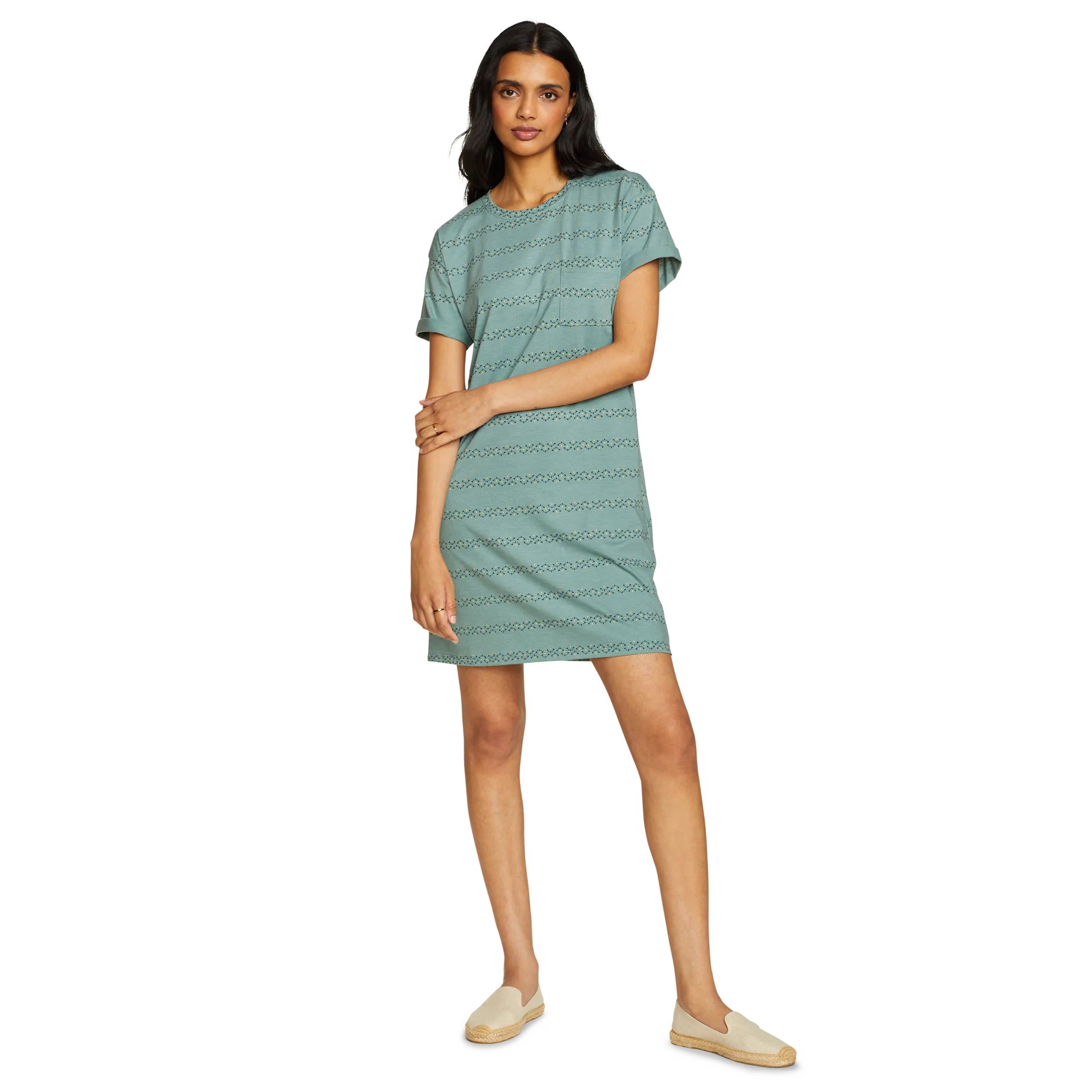 Soft, moisture-wicking fabric makes this knee-length T-shirt dress an all-day favorite. Its simple, flattering lines and easy-care convenience also make it a great traveler.